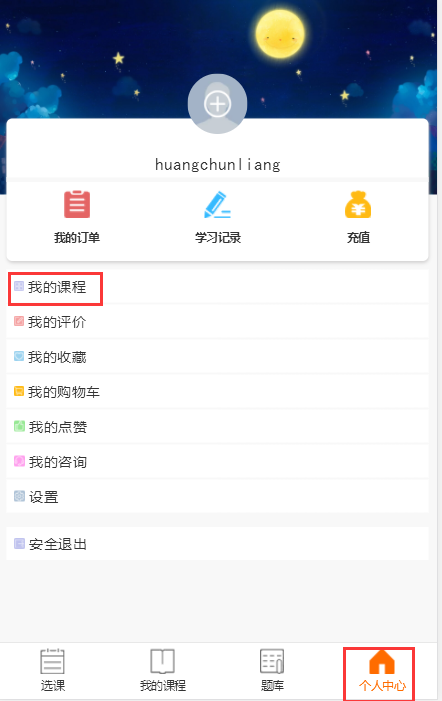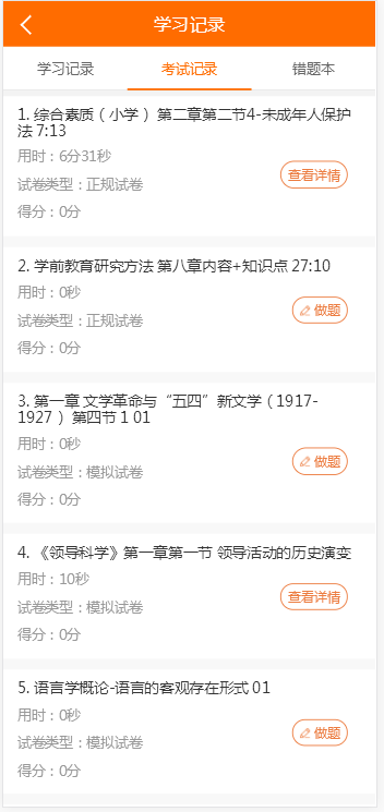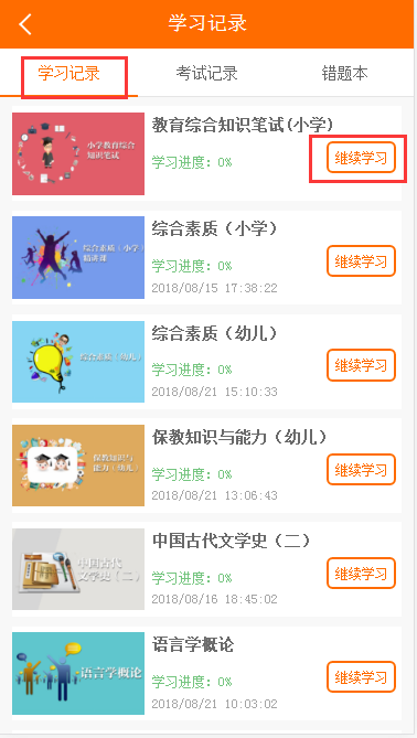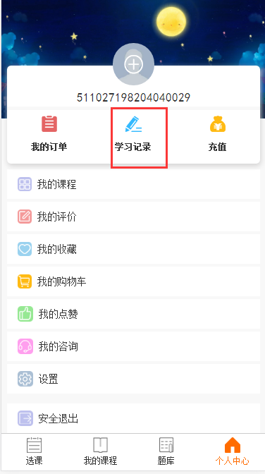 点击个人中心→学习记录,查看自己学习课程的进度,试题练习情况及错题情况。