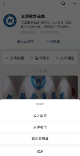 2、关注“文顶教育在线”公众号,点击导航栏“文鼎课堂”→选择自学考试→输入学员本人账号(身份证号)、密码(初始密码123456),点击登录后选择相关课程开始学习。