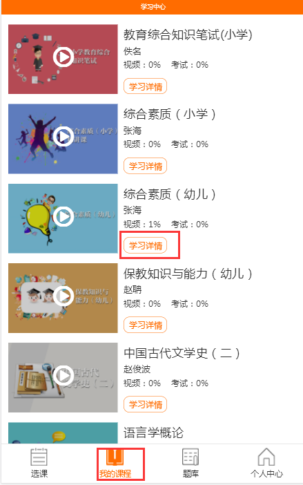选择我的课程→选择要学习的课程→学习详情,查看具体课程的观看情况。
