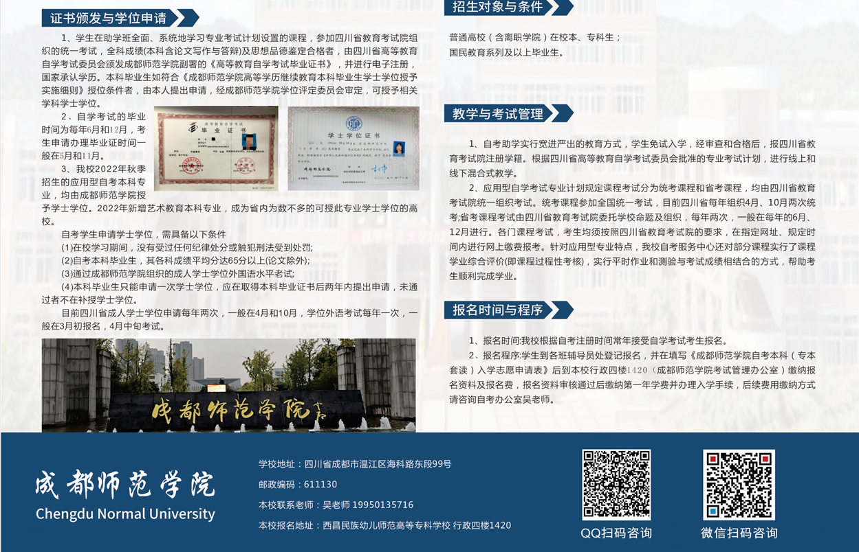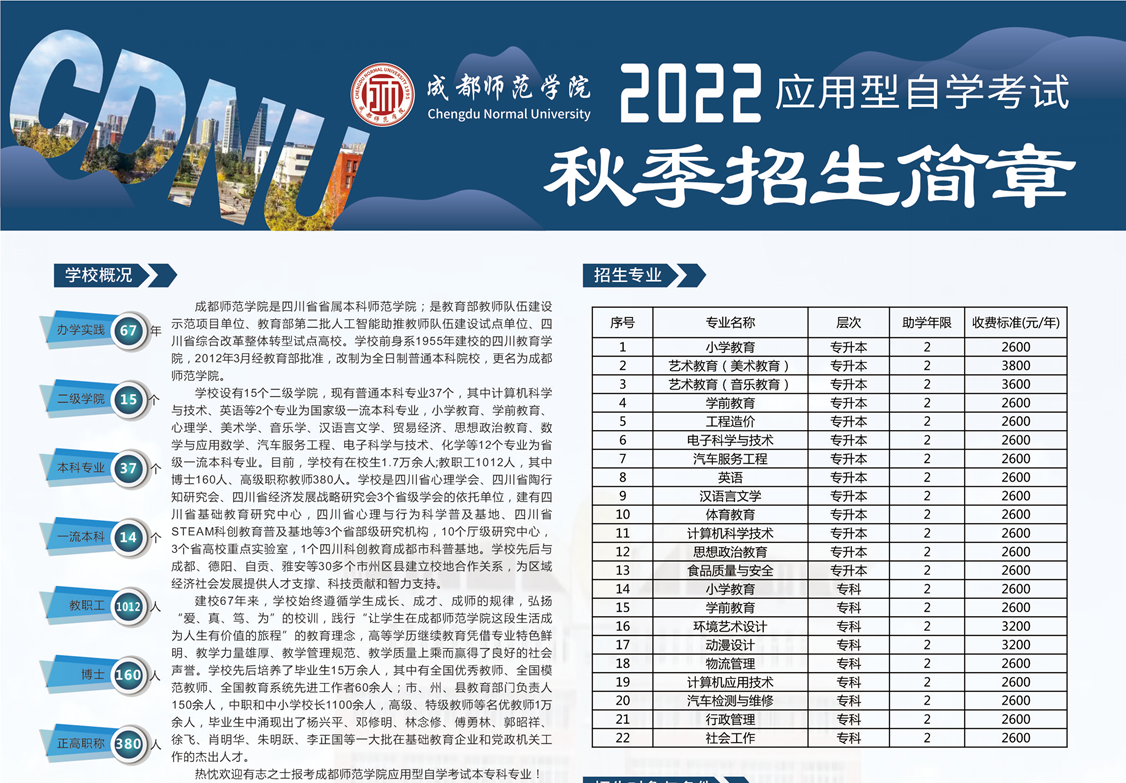 为进一步提高我校柚子们的学历水平,增加社会竞争力,我校与成都师范学院签订了应用型自考助学协议。2022年秋季新生入学报名已开始,现将有关报名事项通知如下: