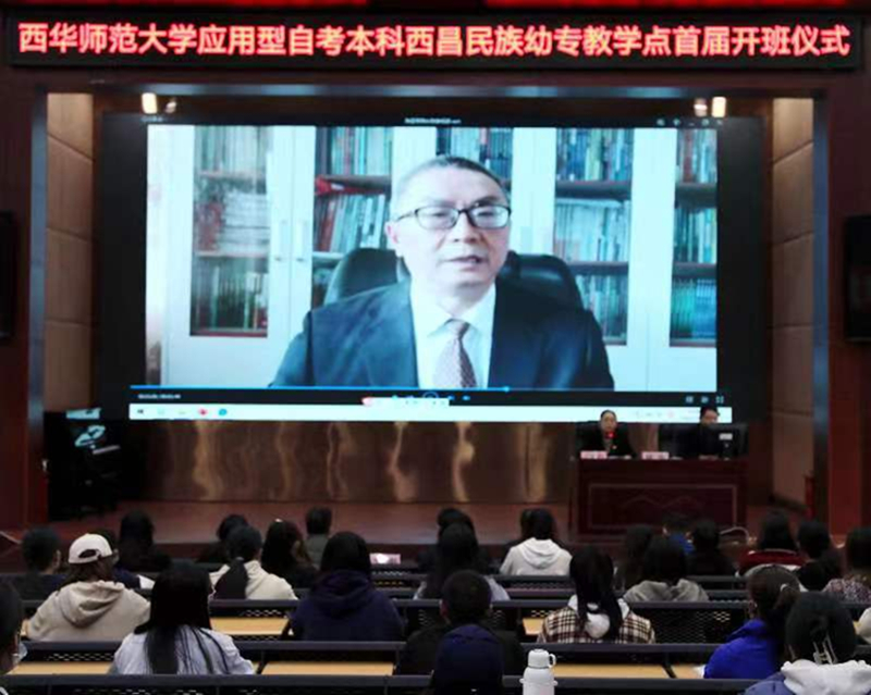 西华师范大学继续教育学院院长陈亚军为西昌民族幼专教学点首届新生开班仪式致辞。首先,陈亚军院长代表西华师范大学继续教育学院对西昌民族幼专教学点西华师范大学应用型自考本科首届开班仪式表示热烈祝贺,强调了作为我国高等教育重要形式的高等教育自学考试是提升自身学历和个人素养的有效途径。其次他对首届新生提出了三点希望,一是要有攻坚克难的思想准备,加强自我修养,做到统筹兼顾、善思勤学;二是坚定信心,合理安排时间做到专业课程和自学考试两不误;三是拓展信息渠道,自觉吸收学校和社会正能量,做到德才兼备。最后,陈亚军院长参加开班仪式的老师和同学们表达了美好的祝愿。