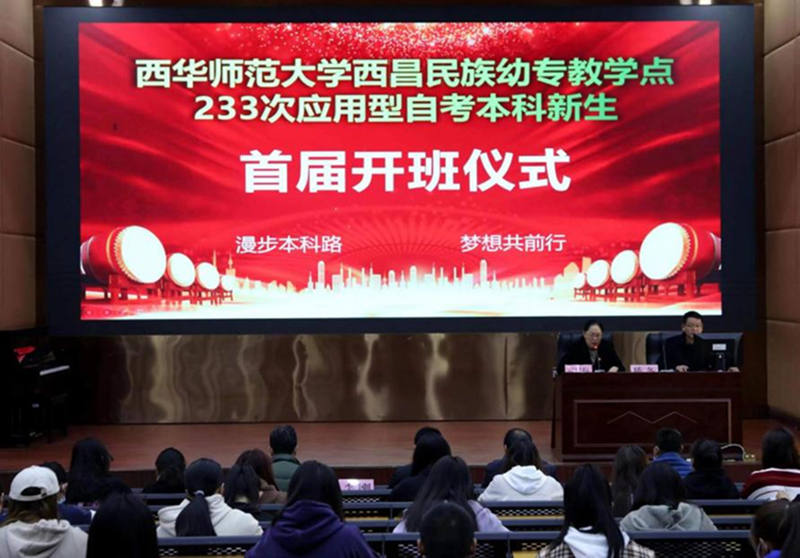 12月6日下午,西昌民族幼儿师范高等专科学校233次应用型自考本科新生开班仪式在学校学术报告厅B厅举行。西华师范大学继续教育学院陈亚军院长、西华师大自考学习服务中心教师陈冬、教师发展处处长马娅群、学前教育系主任余成红、职业教育系书记李刚、小学教育系副主任赵世望、基础教学部副主任刘强、靳功全应邀出席开班仪式,233级全体新生113人参加开班仪式,仪式由教师发展处副处长范星梅主持。