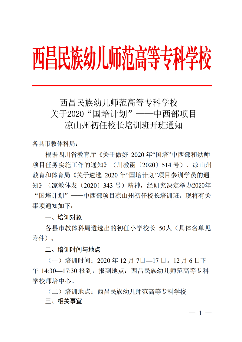 2020年“国培计划”——中西部项目凉山州初任校长培训班开班通知