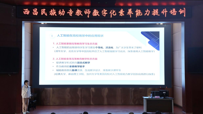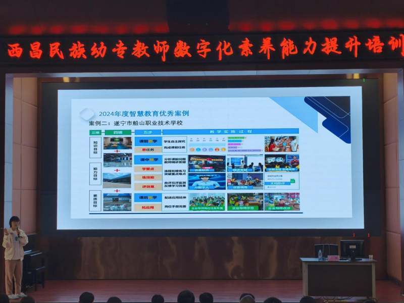 培训中,王嫱深入剖析了AI对教育发展趋势、师生发展的影响,以“脑腐化”“技术双语主义”等前沿概念引导培训教师思考当今教育的新形态。她通过分析遂宁市船山职业技术学校多元评价体系、成都高新区西芯小学数据驱动教学优化等2024年智慧教育优秀案例,为教师提供参考。