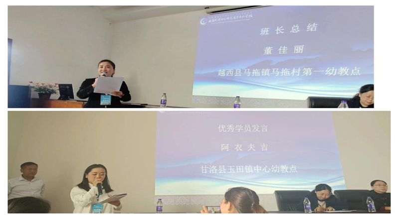 结业典礼上,西昌民族幼专教师发展处处长(培训中心主任)马娅群处长宣布了本次培训班的优秀学员名单;范星梅副处长并对本次办班情况进行了总结。同时,两位项目负责人希望老师们返岗后,继续在岗位上发光发热,因地制宜的施教,积极探索实践新理论,努力提高业务技能。