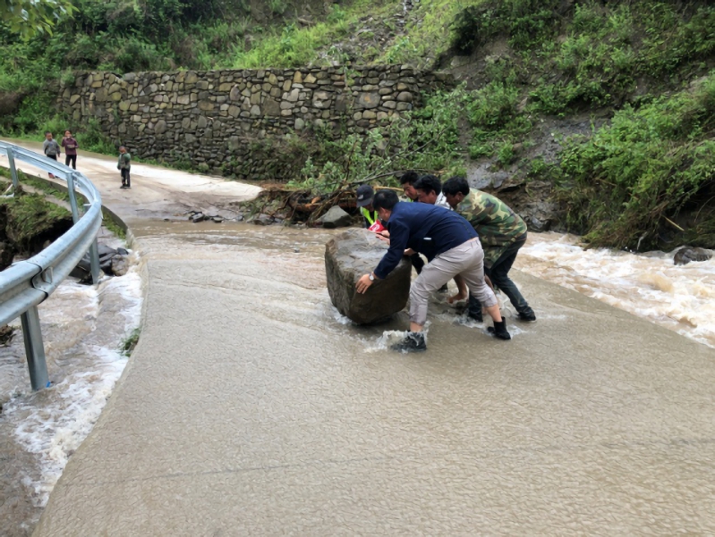 和当地干部、村民一起清理、疏通公路