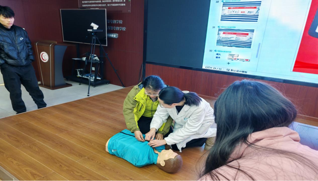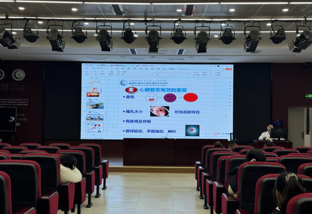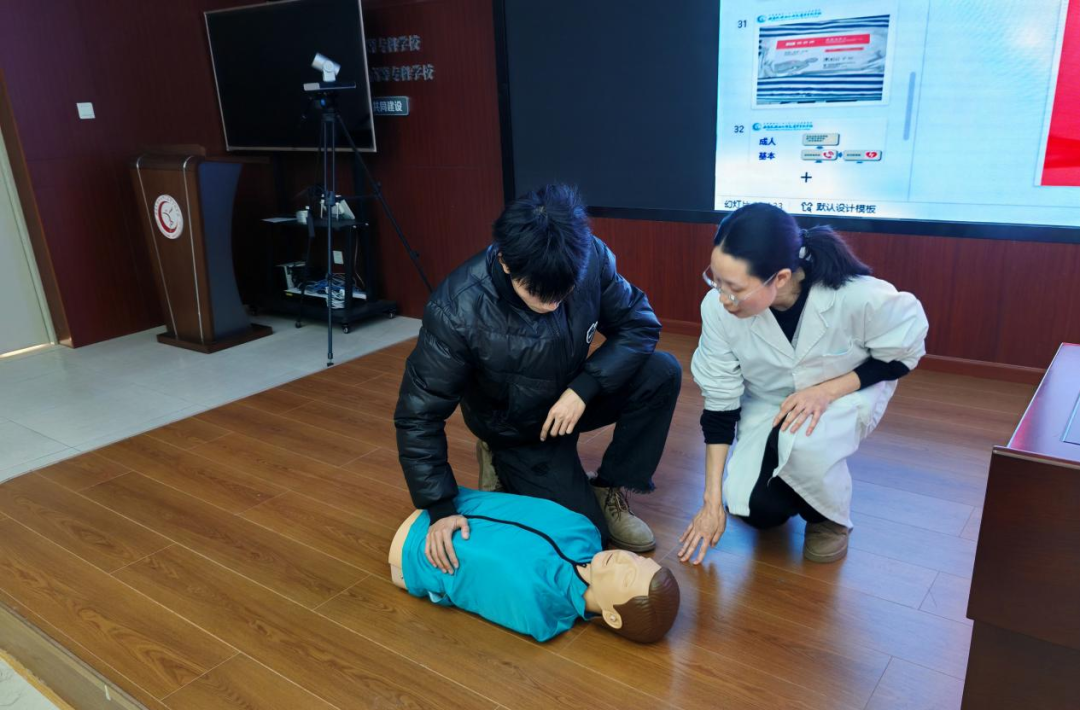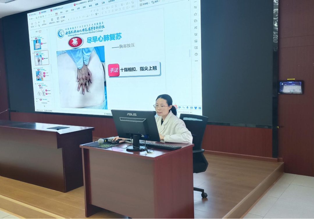 我校医务室李燕医生从急救理论知识和实操环节对师生们进行了专业培训。首先讲解了心肺复苏术、自动体外除颤仪(AED)使用、气道异物梗阻的应急处理等相关理论知识。