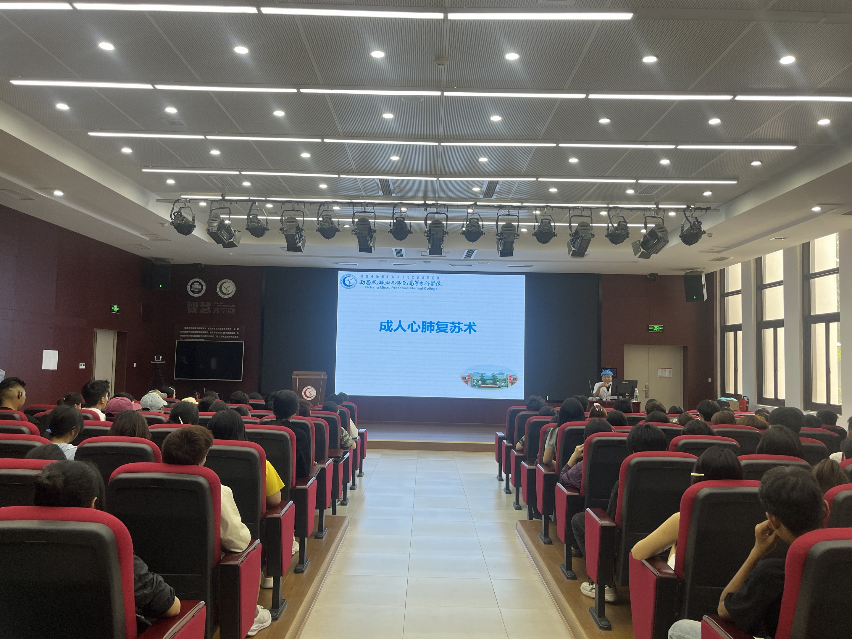 我校医务室骆选飞医生首先讲解了成人心肺复苏术、自动体外除颤仪(AED)使用、气道异物梗阻的应急处理等相关理论知识。