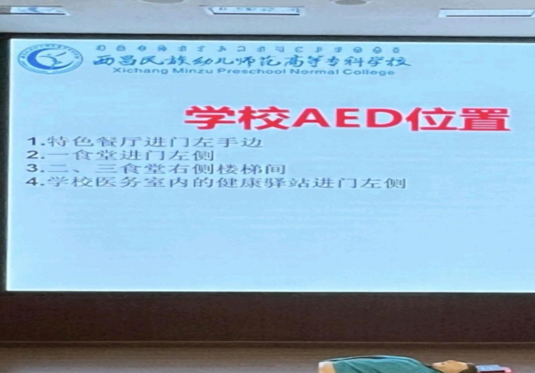骆选飞医生还对校园AED的管理及操作使用方法进行培训,并告知参训师生学校的6台AED设备分别放置在校园内的特色餐厅进门左手边,一食堂进门左侧,二、三食堂右侧楼梯间,学校医务室内的健康驿站进门左侧。