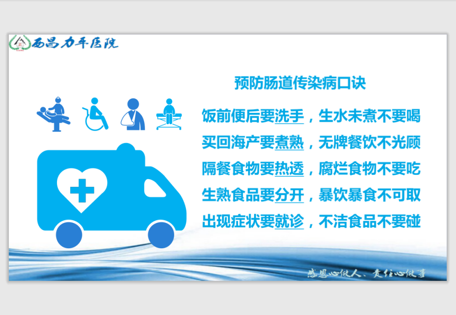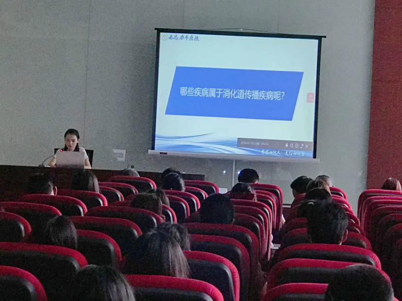 第一个专题主要针对夏季消化道传播疾病的预防和处理,重点讲解了疾病知识、预防行为,让师生们了解了哪些属于消化道传播疾病,它的种类有哪些,以及应该如何预防和处理。一是合理安排饮食,注意膳食均衡营养;二是注意饮用水和食品卫生;三是注意个人卫生和饮食卫生;四是注意居室通风,保持空气新鲜;五是清洁环境,灭蝇灭蟑,避免污染食物;六是特别强调不得公用餐饮用具。