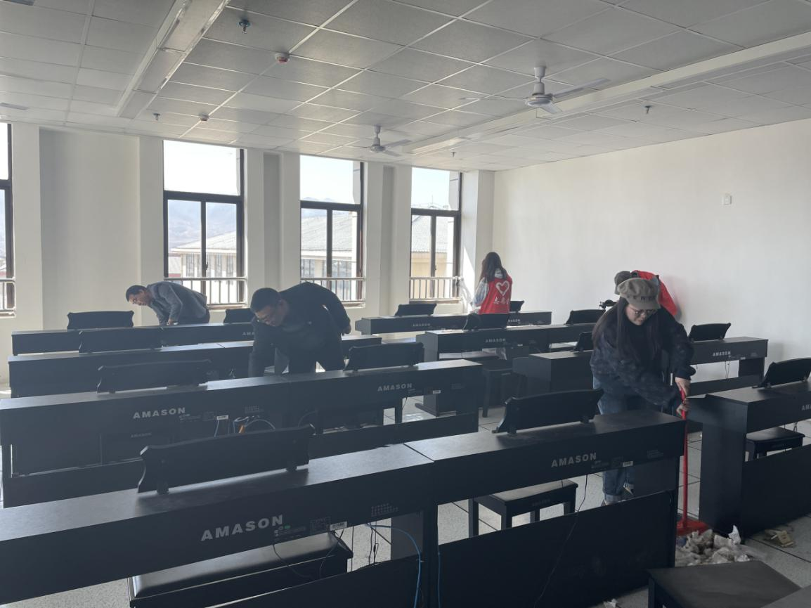 在场党团员同志到艺术楼五楼音乐教室、电钢琴教室进行大扫除。师生们带着扫帚、水桶、抹布,清理卫生死角、生活垃圾,发扬了不怕脏、不怕苦、不怕累的精神,分工合作,干劲十足,充分发扬共青团员、共产党员“特别能战斗、特别能吃苦、特别能奉献”的精神,努力向雷锋同志致敬。