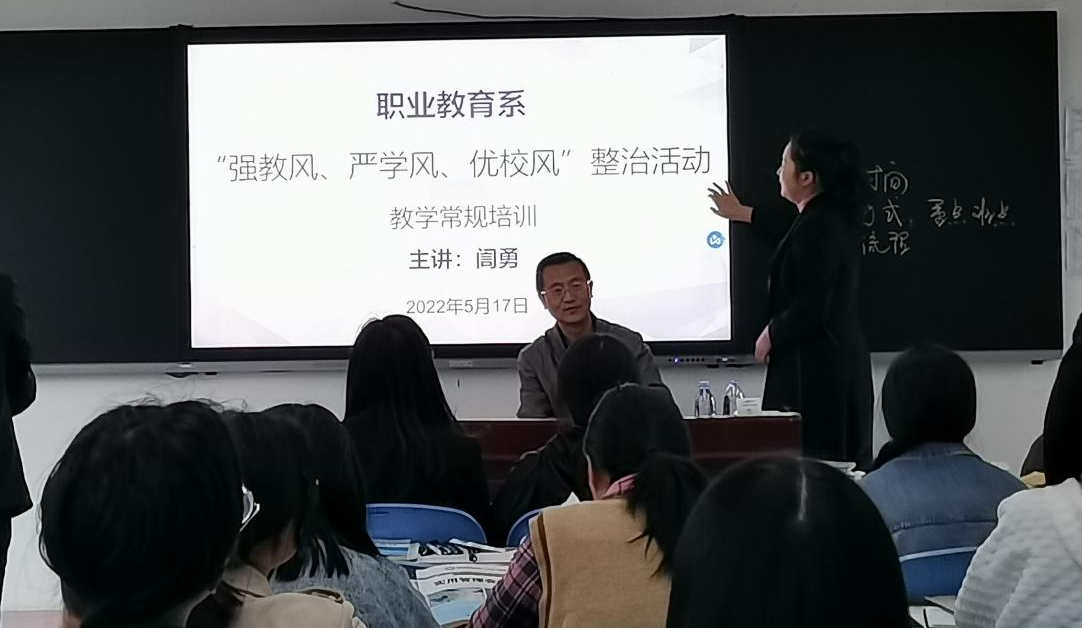 5月17日下午,职业教育系邀请迎评促建办公室訚勇教授为系部教师举行教学常规培训。訚勇教授就如何备好课、如何写好教案两个主题详细向我系教师进行了讲解,并耐心与教师们进行一对一交流答疑解惑,帮助教师们梳理准备教学资料过程中的痛点和难点,协助我系教师进一步提升教学能力。