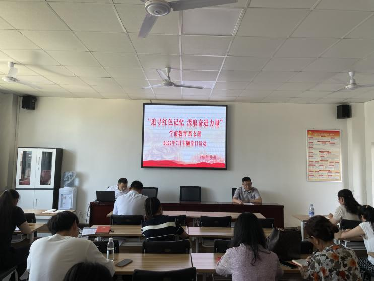 为庆祝党的101年华诞,学前教育系支部于2022年7月6日在4308室举行了以“追寻红色记忆 汲取奋进力量”为主题的7月党建月会。深情回顾党的奋斗历史,热情讴歌党的光辉业绩,继承和发扬党的光荣传统和优良作风,进一步激励广大党员坚定理想信念,激发历史责任感,增强民族自豪感与自信心。会议由党支部组织委员苗超渊同志主持,学前教育系党支部全体党员参加了本次会议。