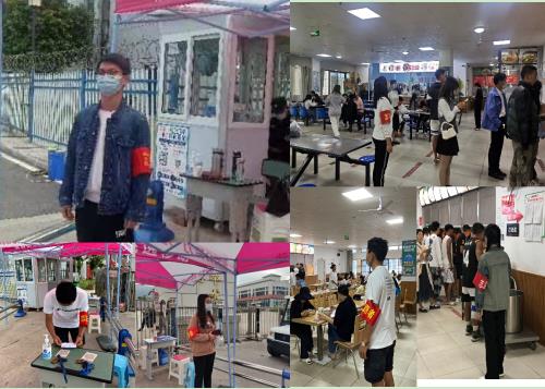 为维护校内师生健康和安全,校内党员同志按照学校的N+1工作任务表准时准点积极参加门岗、食堂、学校超市,维持体育馆核酸检测秩序。他们的身影格外高大。