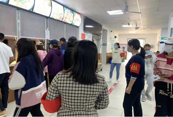支部党员突击队在早、中、晚餐时坚持在岗、坚守主责,引导师生科学防疫。就餐期间,师生严格戴口罩进食堂,有序、有间距地排队打餐,按疫情要求单向分坐就餐。党员突击队全力投入疫情防控工作,筑牢疫情防控屏障,保障校园安全稳定。