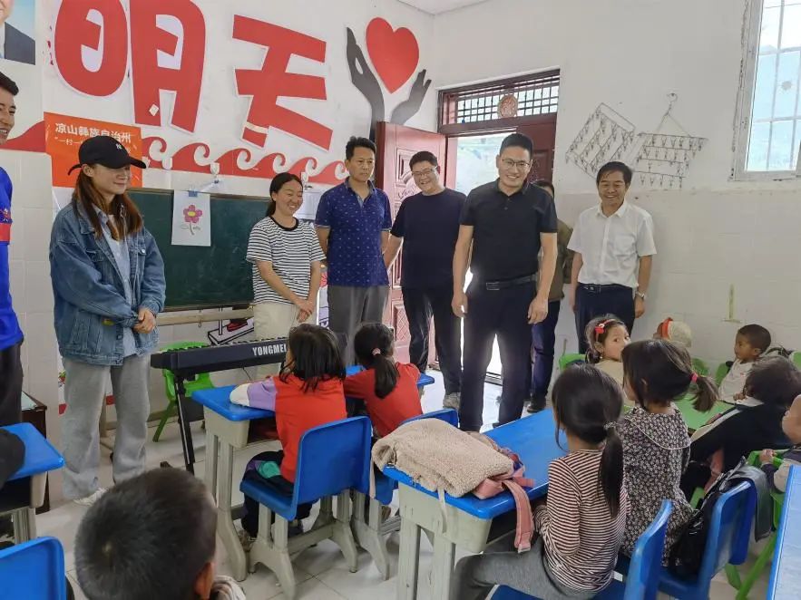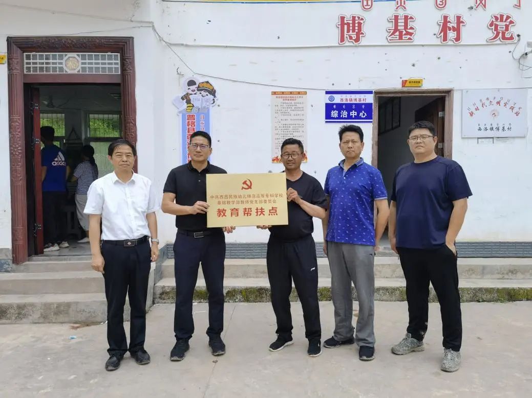 在博基村第一幼教点,沙书记一行看望了在幼教点支教的基础教学部学生,跟幼教点小朋友进行了互动,并举行了基础教学部教师党支部“教育帮扶点”授牌仪式。