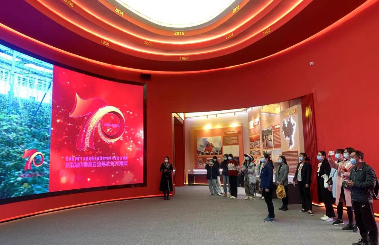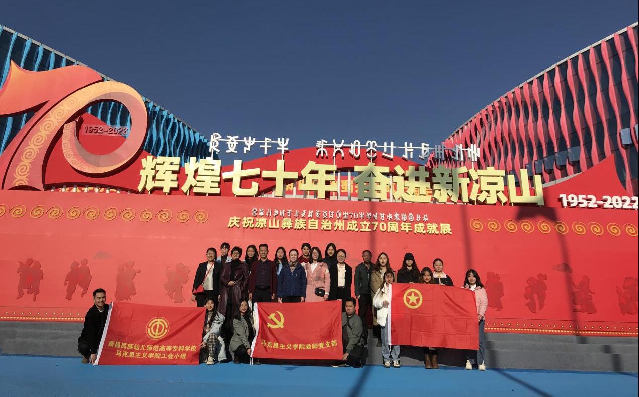 为深入学习了解凉山彝族自治州成立70年来的光辉历程、辉煌成就和发展经验,凝心聚力开启新时代全面建设社会主义现代化凉山新征程,12月9日下午,马克思主义学院教师党支部,积极发挥党建带团建促工建的作用,带领全体党员教师、工会成员、部分共青团员学生,参观学习建州70周年庆祝活动点位,开展了“庆建州70周年 忆光辉峥嵘岁月”的主题活动。