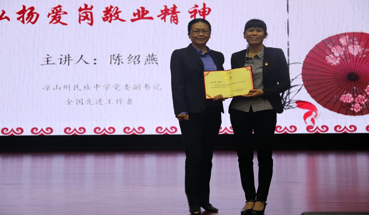 讲座结束后,王玉萍副书记为陈绍燕老师颁发西昌民族幼儿师范高等专科学校校外辅导员聘任证书,对陈绍燕老师老师的务实、勤奋、奉献与坚守致以崇高的敬意。她希望现场师生通过“一月一讲堂”系列讲座,能够有所感、有所悟、有所动,在今后的工作和生活中,自觉向榜样看齐,身体力行,为学校的发展、为民族地区的教育事业贡献力量。