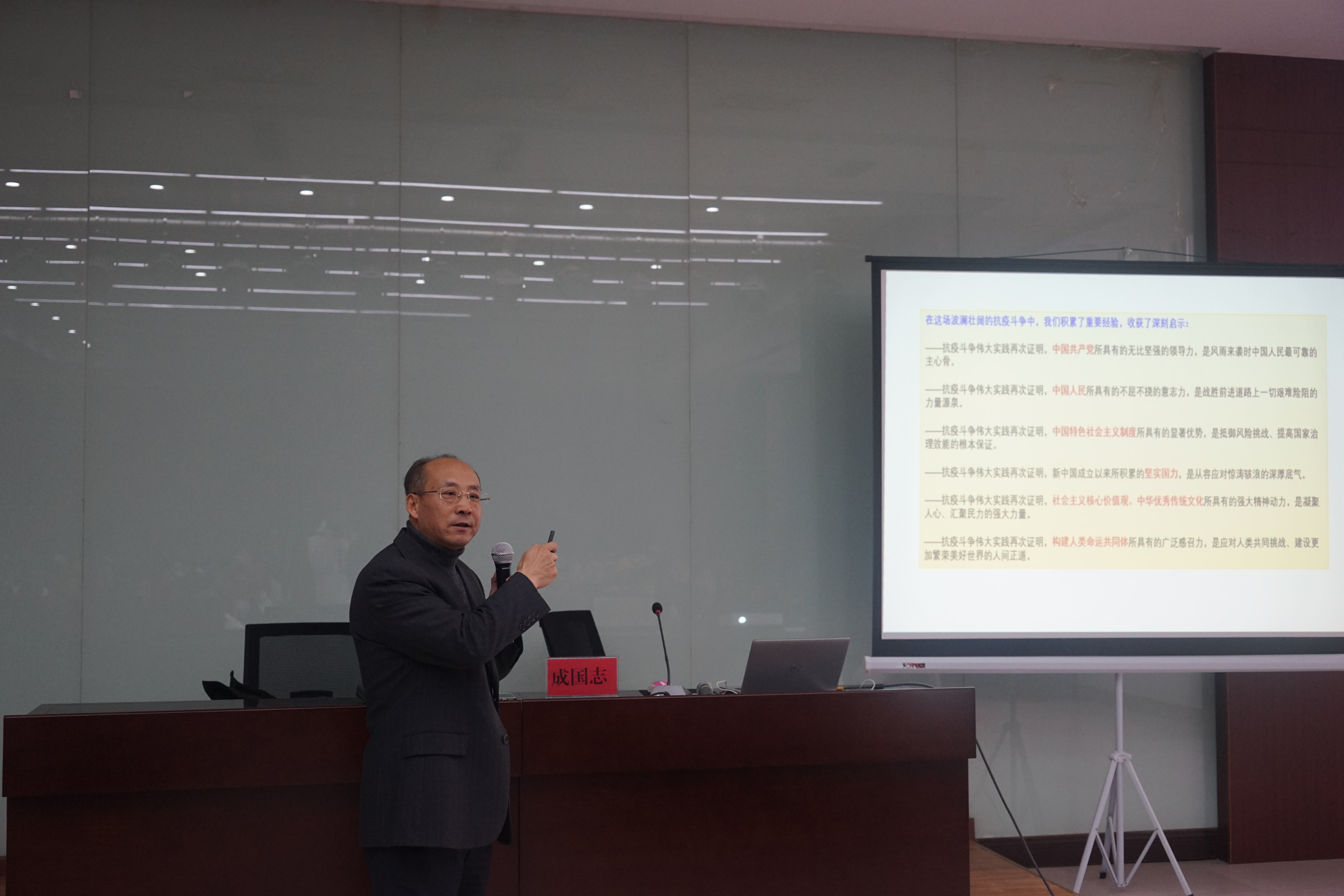 1月8日,副校长成国志以《读懂抗疫大考的“中国答卷”》为主题,在学校学术报告厅为部分师生讲授了一堂生动的形势与政策课。