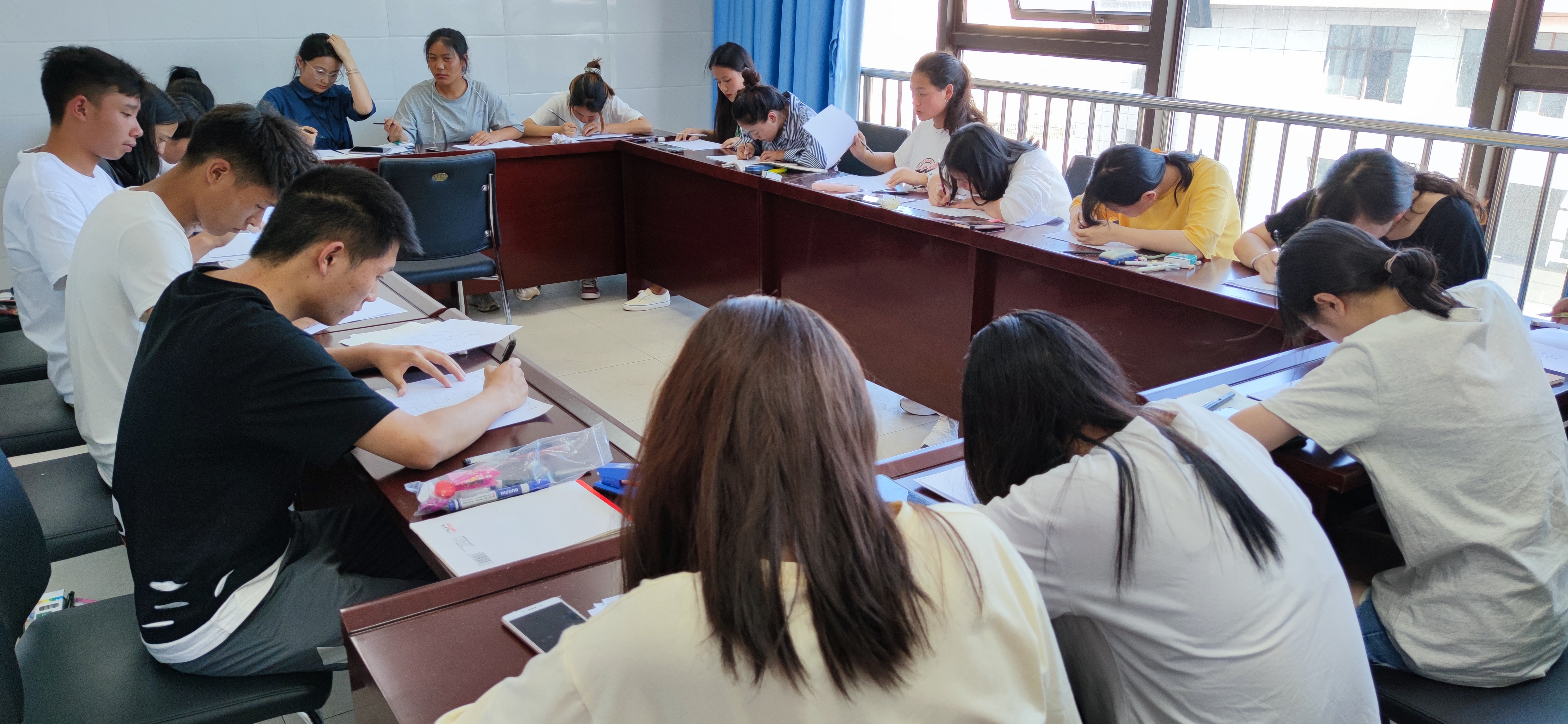 5月21日下午,思政班学生分为两组进行了书写技能考核,大家按照教师资格证的考核要求分别就钢笔字、粉笔字和简笔画进行了现场书写。