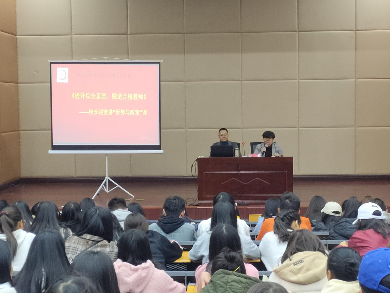 12月24日学校校长赵波在学术报告厅A厅以“提升综合素质  锻造合格教师”为题,为学生讲“形势与政策”课。思政处临时联络员的嫫思雨主持。