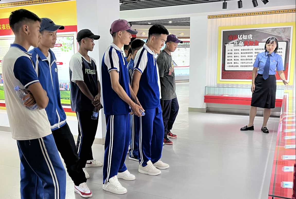 随后,在检察院工作人员的带领下,师生们参观了妇女儿童权益保障示范岗及禁毒防艾青少年法治教育基地。这些场所展示的内容不仅包含了相关法律法规知识,还体现了对于未成年人保护工作的重视,通过诸多生动的案例向学生们阐释遇到问题时应如何正确运用法律维护正义、保障权益。特别是针对毒品危害与艾滋病预防的知识普及,进一步增强了学生们的自我保护能力和社会责任感。