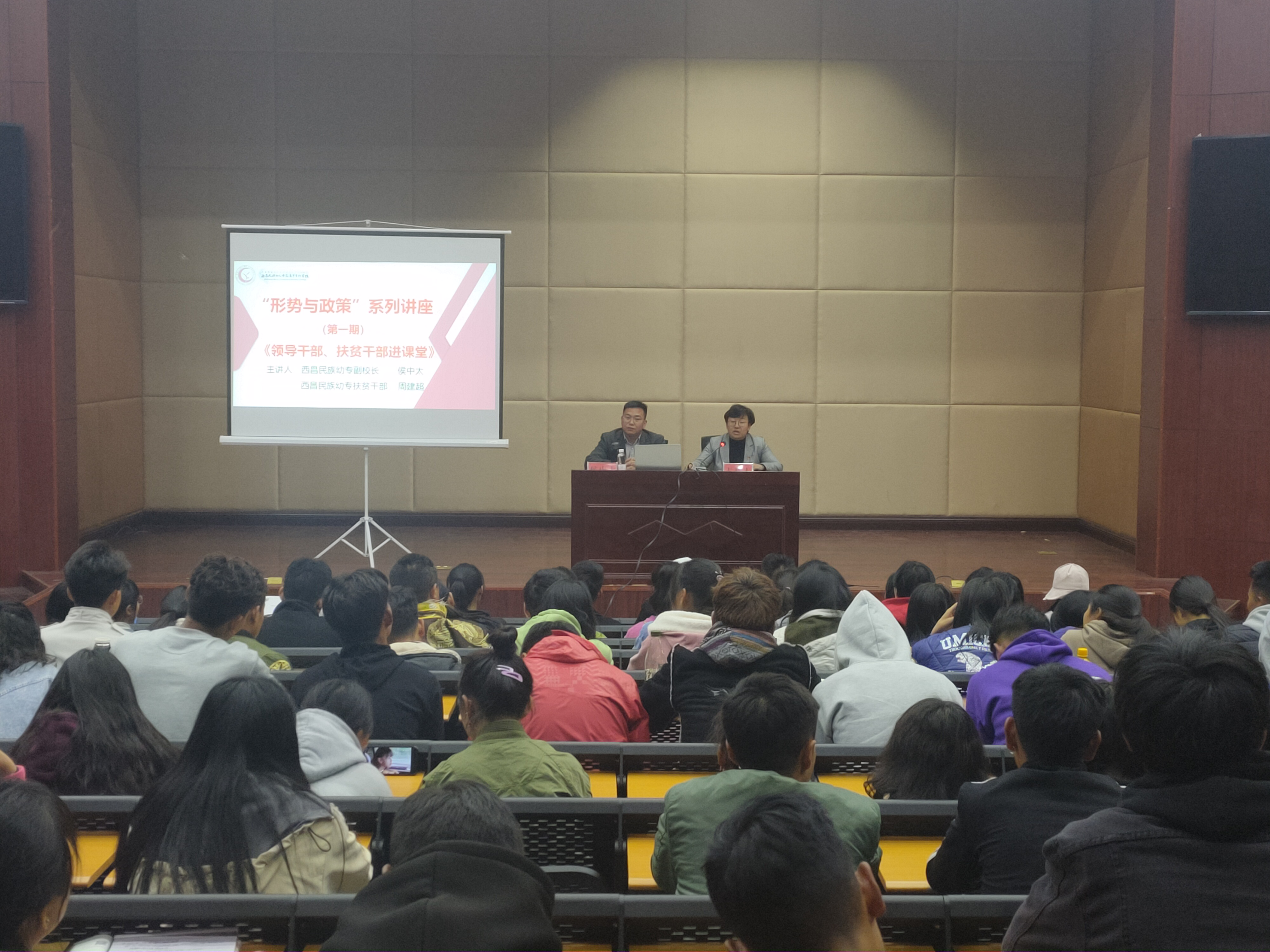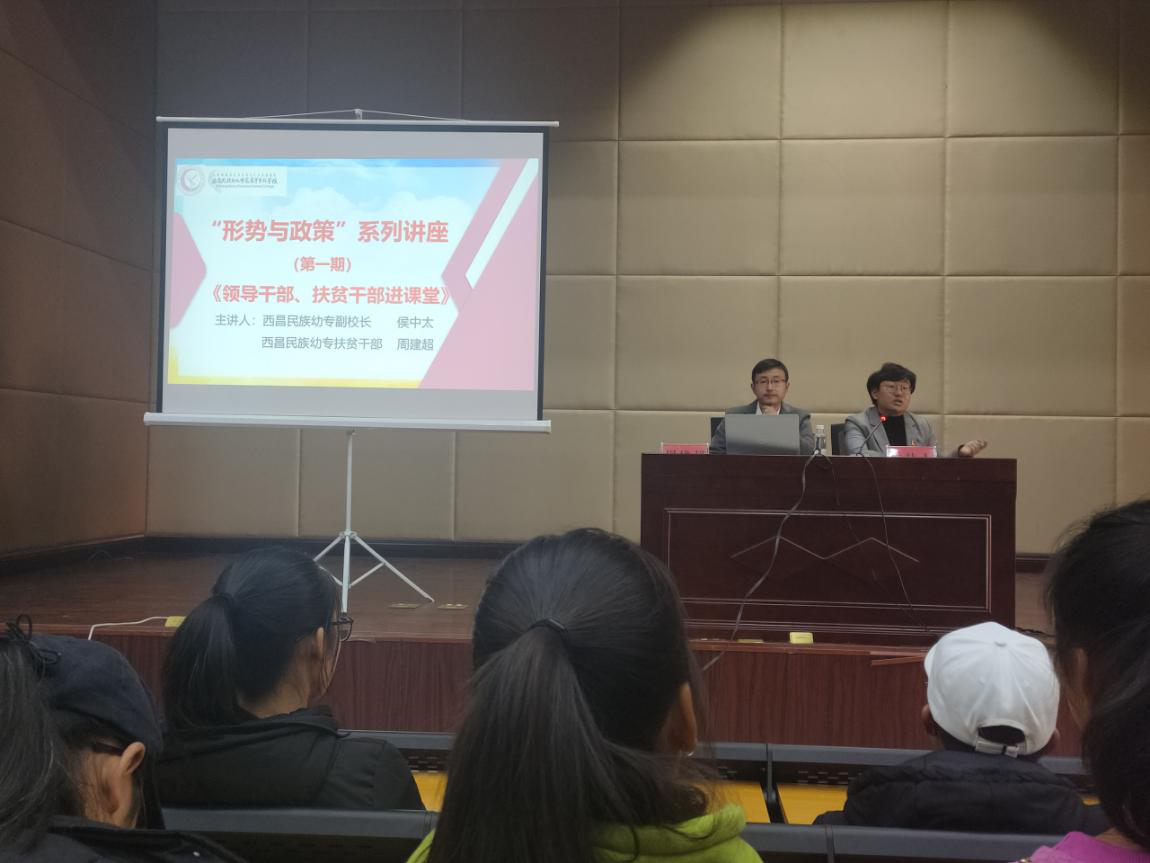 为贯彻落实习中组部、教育部印发的《关于领导干部上讲台开展思想政治教育的意见》《关于加强新时代高校“形势与政策”课建设的若干意见》等文件精神,12月10日下午,学校副校长候中太和思政处一线扶贫干部周建超在学术报告厅A厅为师生代表上“形势与政策”课,思政处临时联络员的嫫思雨主持。