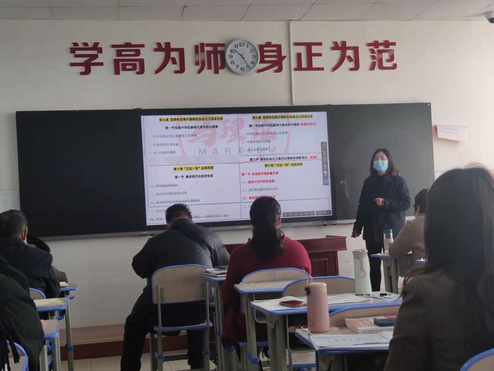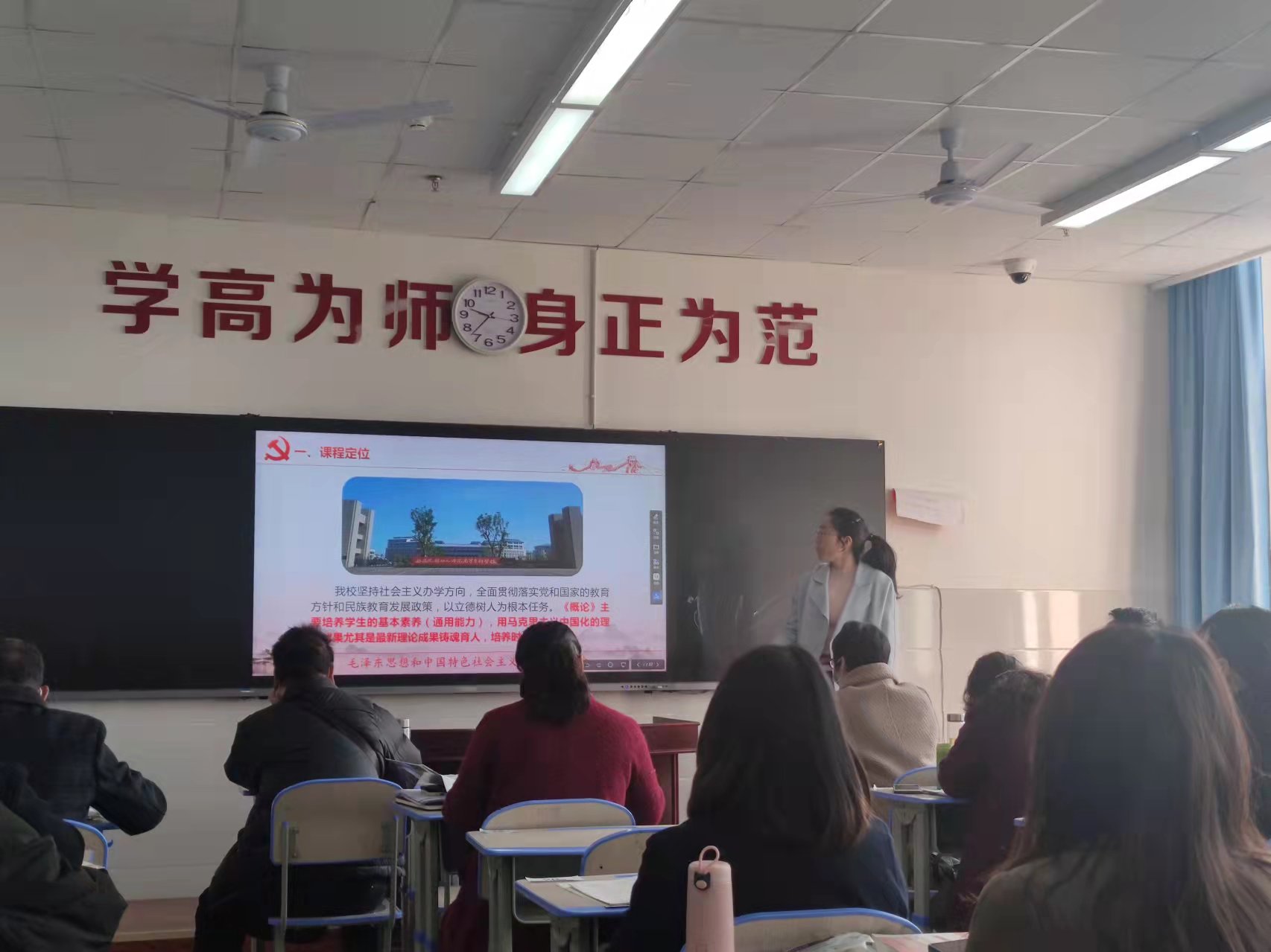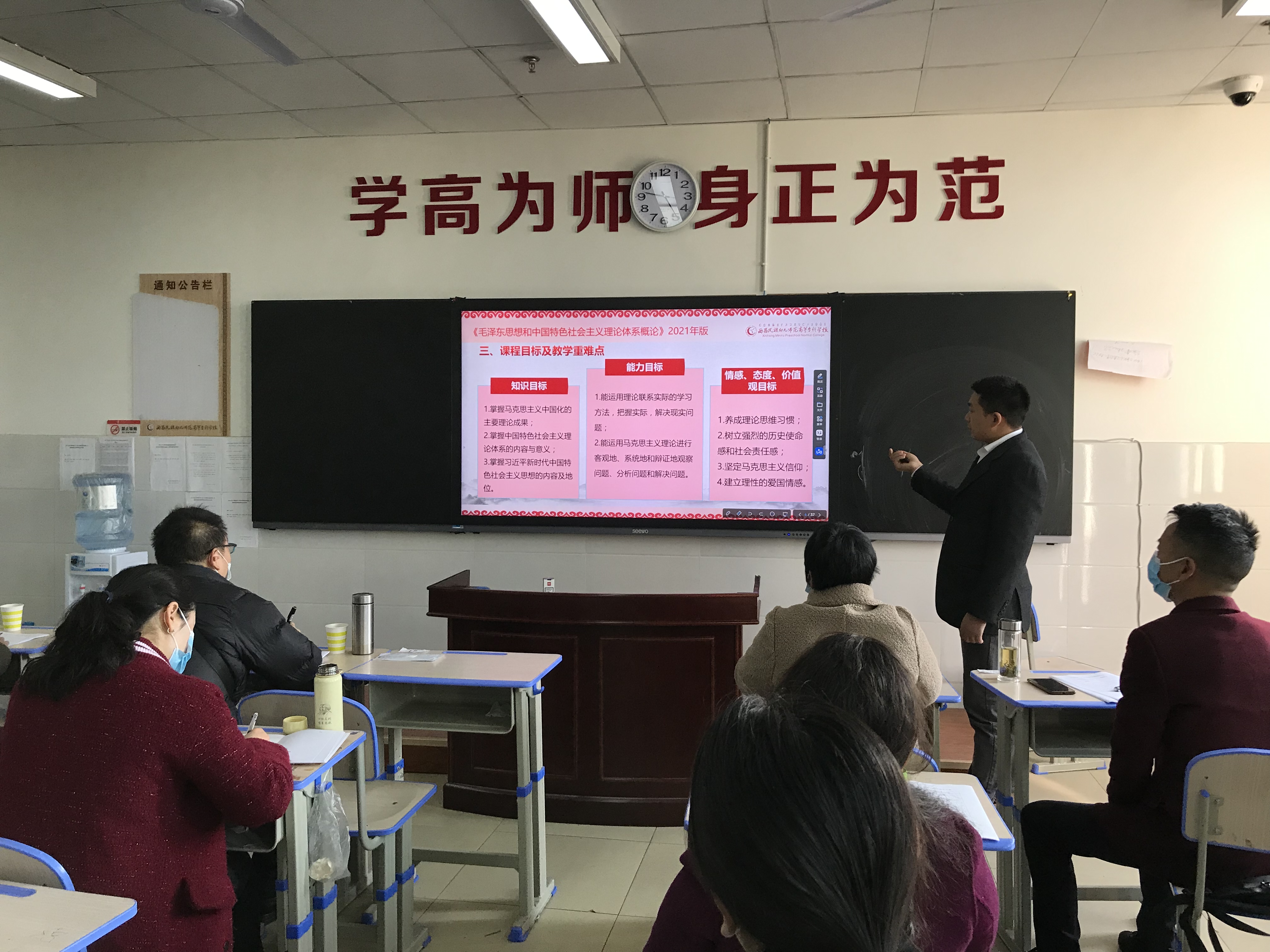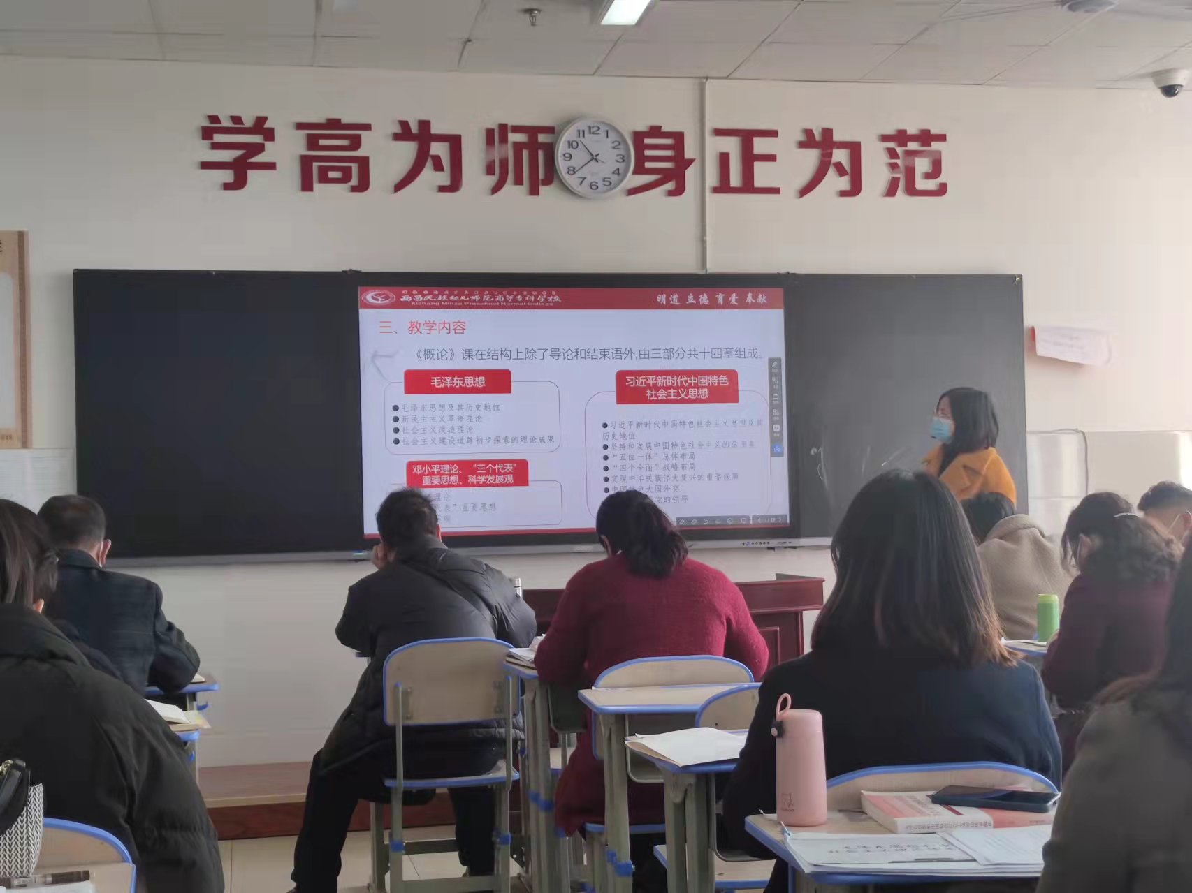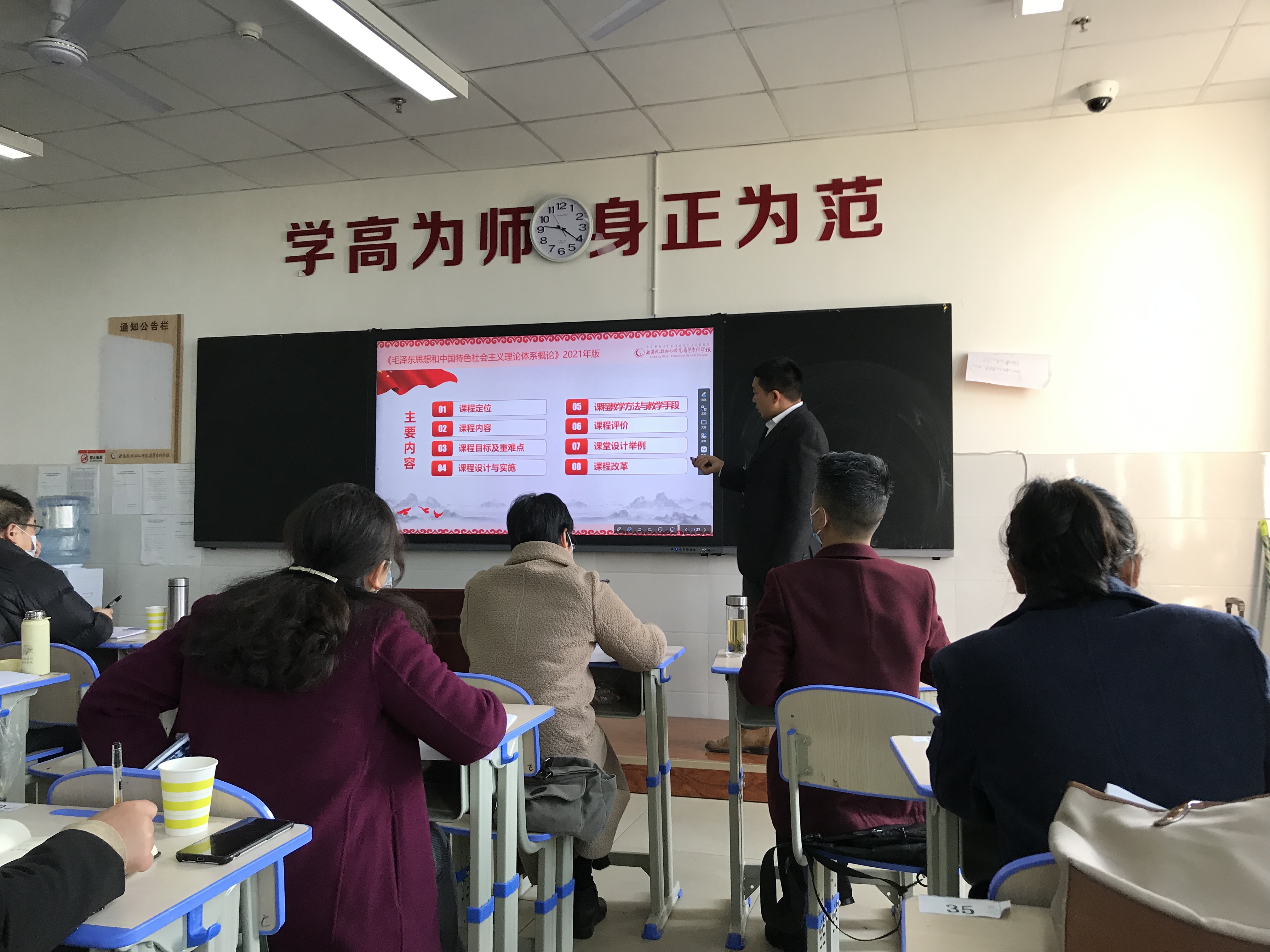 为贯彻落实学校关于2022年春季学期开课前说课的安排部署,进一步提升思政部教师的教学技能和业务素质,切实提高课堂教学质量,2月26日上午,思政部全体任课教师在第一教学楼1418教室进行了《毛泽 东思想与中国特色社会主义理论体系概论》的说课活动。教务处雷胜建老师、图书馆訚勇老师、教师发展处马娅群处长、赫宗兰老师参加了本次活动并担任评委。