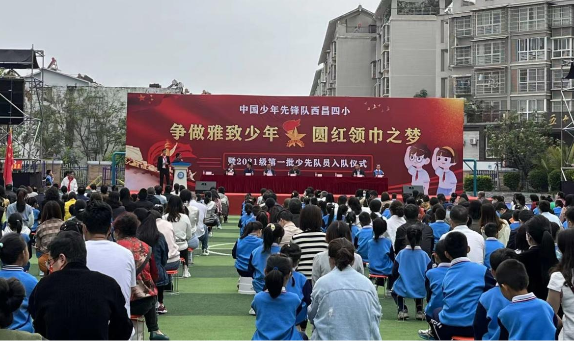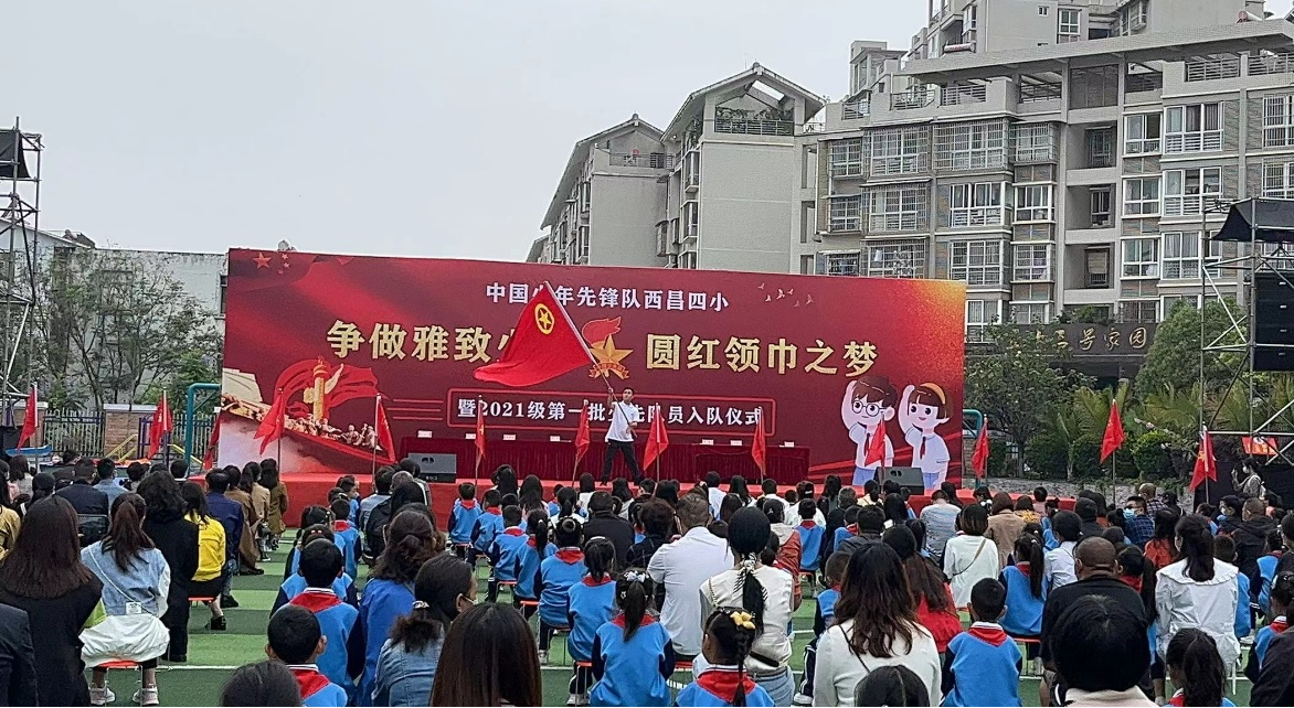西昌市第四小学以习近平新时代中国特色社会主义思想为指导,深入贯彻落实习近平总书记关于少年儿童和少先队工作的重要指示精神和习近平总书记致中国少年先锋队建队70周年贺信精神,在"6.1节前夕开展了此次入队活动。