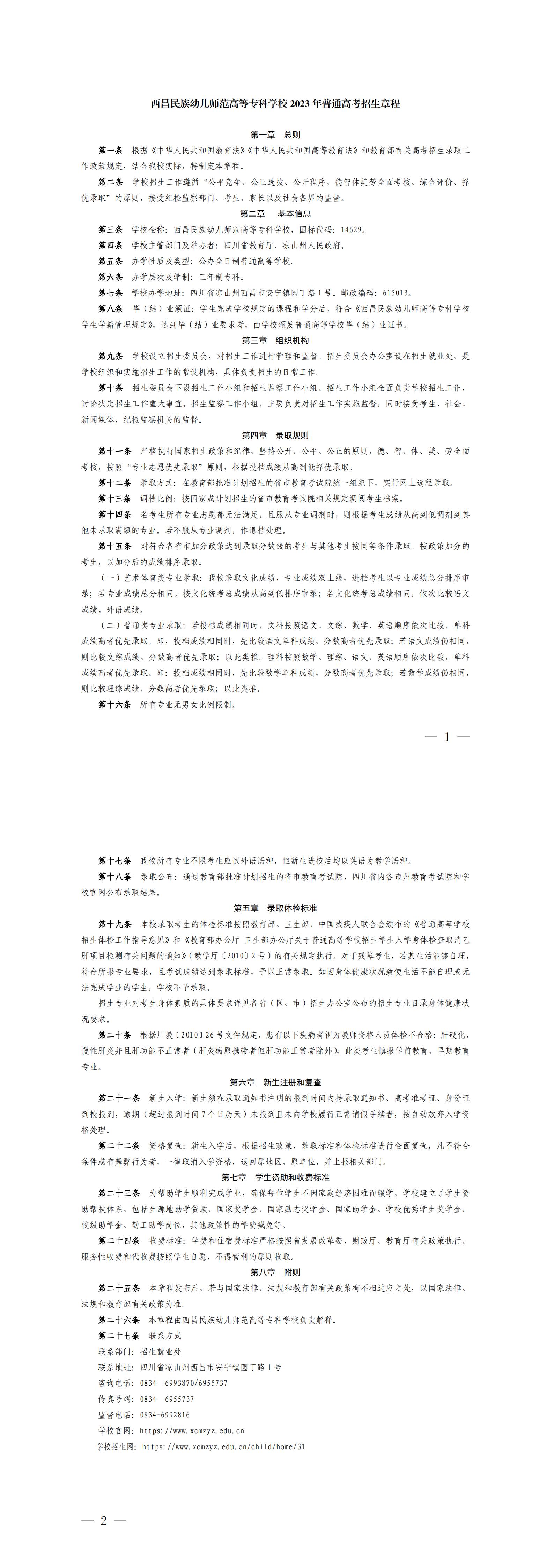 西昌民族幼专2023年普通高考招生章程