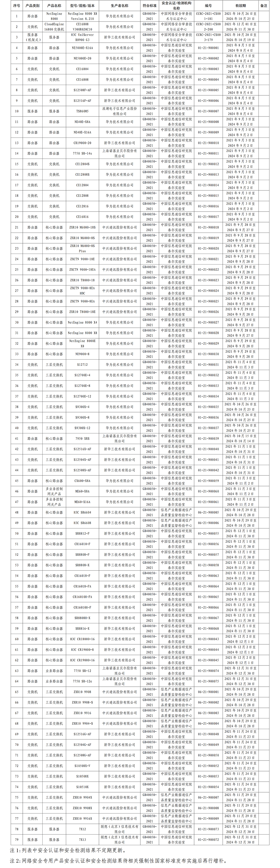 网络关键设备和网络安全专用产品安全认证和安全检测结果