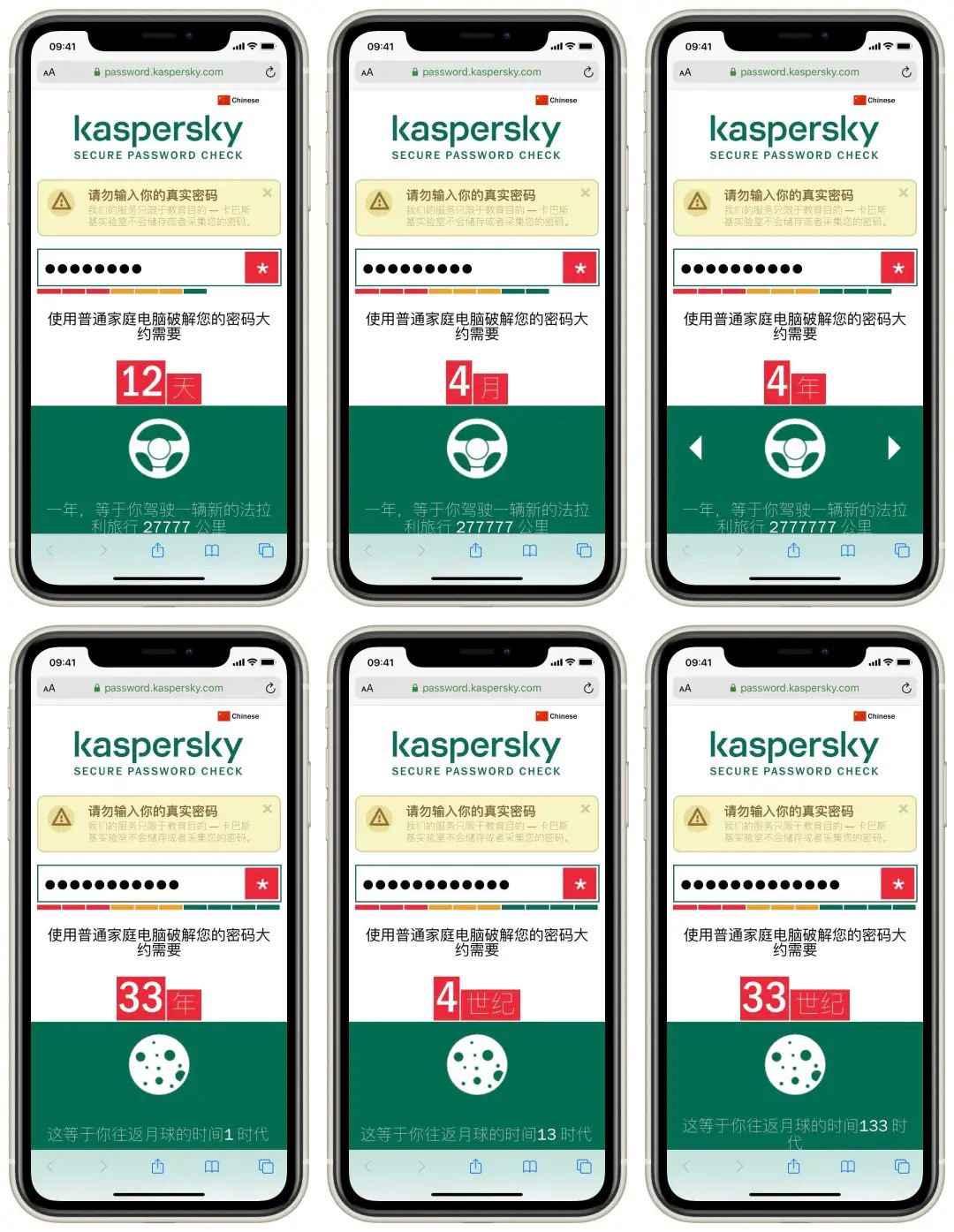 “密越长越安全”,有机构做验证,在密码安全性检测网站Kaspersky上进行实验,分别使用下面6个密码,长度从8位递增到12位,来测试暴力破解所需要的时间: