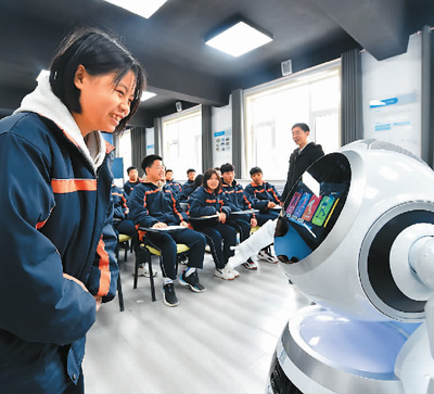 在河北省石家庄市井陉县一所职业技术教育中心,学生进行人工智能机器人调试学习。张晓峰摄(人民图片)