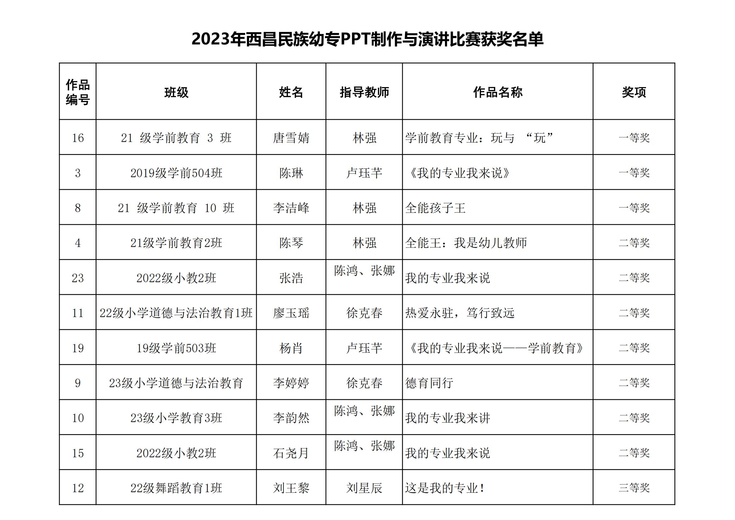 附件:2023年西昌民族幼专PPT制作与演讲大赛获奖名单公示表
