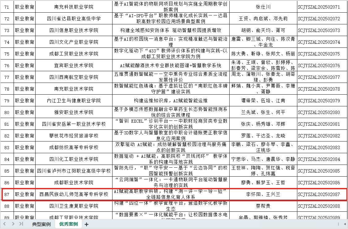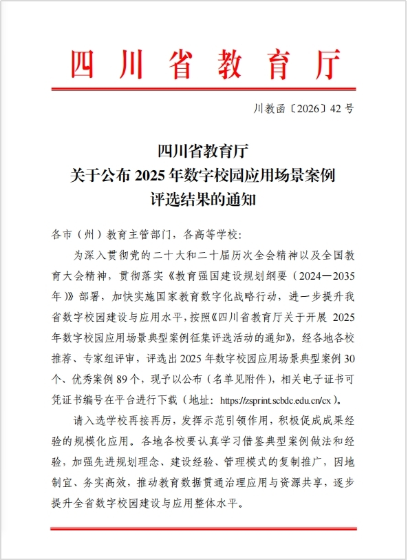 近日,四川省教育厅公布2025年数字校园应用场景案例评选结果,我校信息中心选送的《AI赋能高职教学科研,构建“测—评—学—导—验”全链路信息化育人体系》案例,成功入选职业教育类优秀案例,这是我校在教育数字化建设领域取得的又一重要成果。