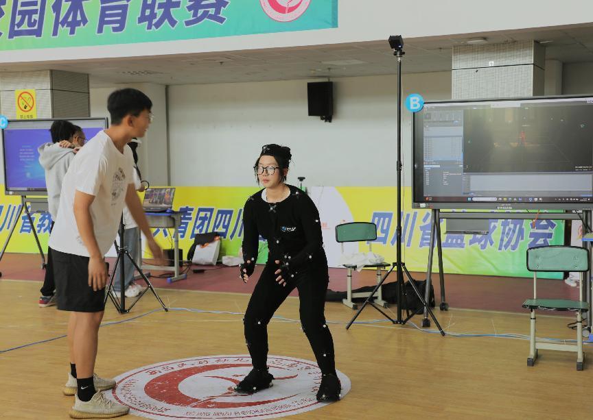 体育馆内布置了多个展区,展示了包括动作捕捉设备、AI智能对话平台以及VR体验等在内的先进数字化设备。