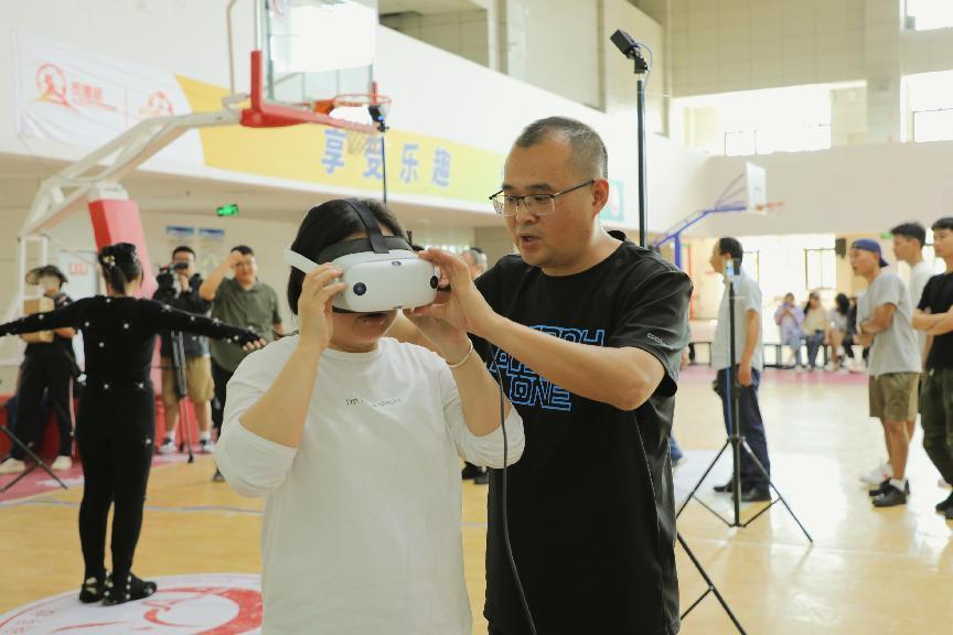 在场的师生们在工作人员的指引下,也纷纷戴上VR头显、握着数据反馈手柄在虚拟世界中遨游,对这次新奇的体验赞不绝口。