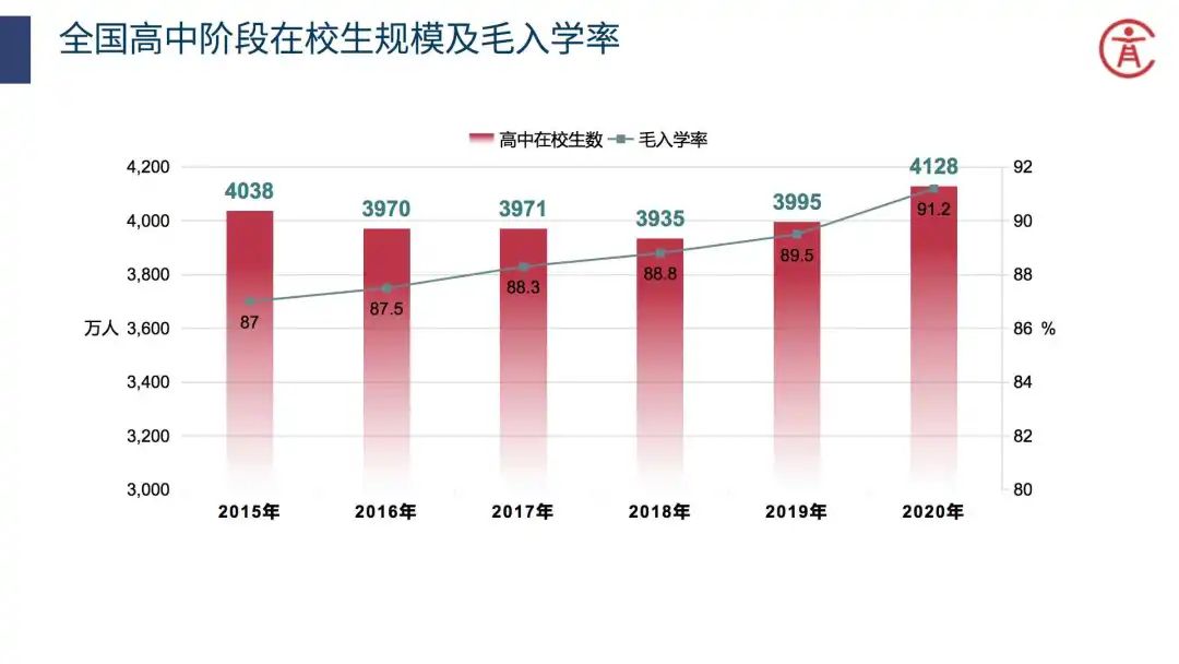 2020年,全国高中阶段共有学校2.44万所。招生1504.00万人,在校生4127.80万人。高中阶段毛入学率91.2%。