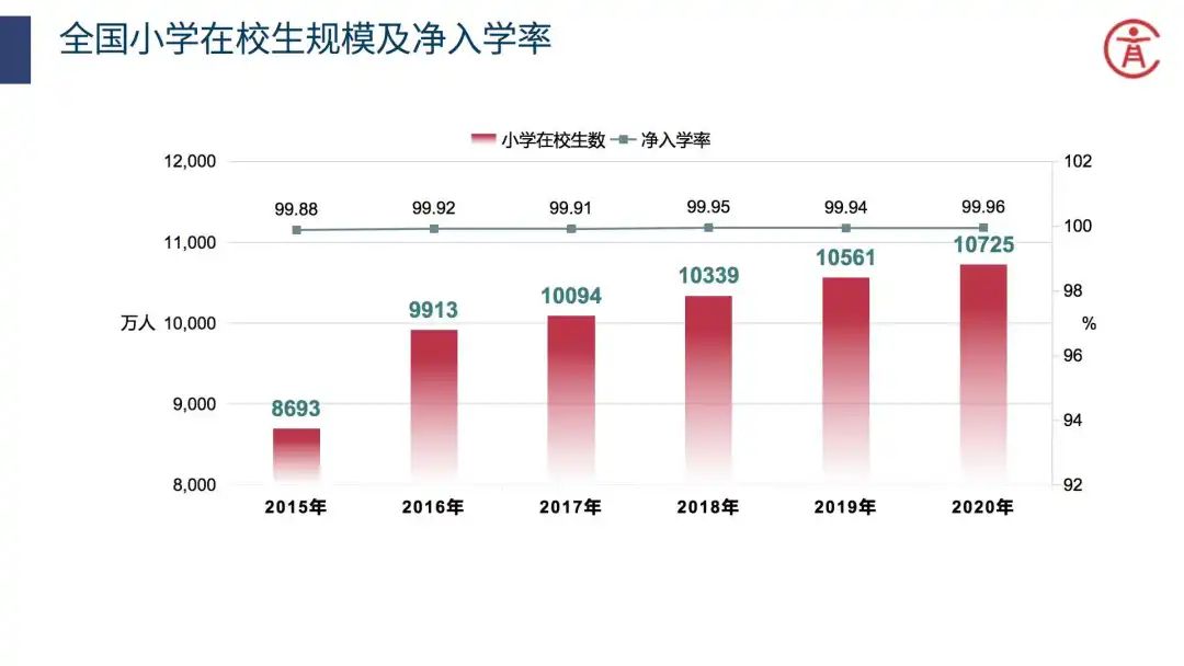 全国共有普通小学15.80万所。小学招生1808.09万人,在校生10725.35万人。小学共有专任教师643.42万人。小学学龄儿童净入学率99.96%。