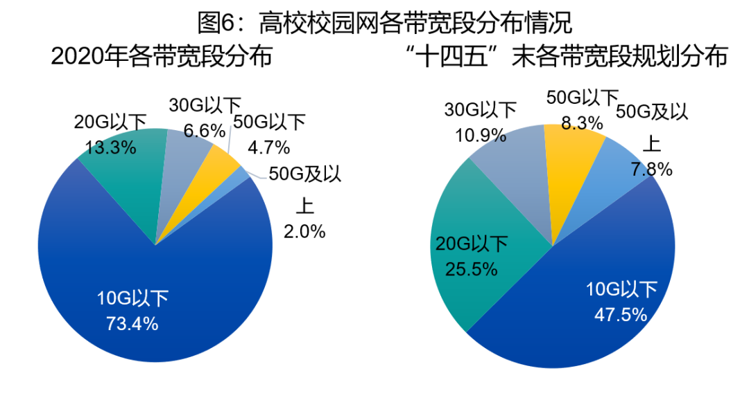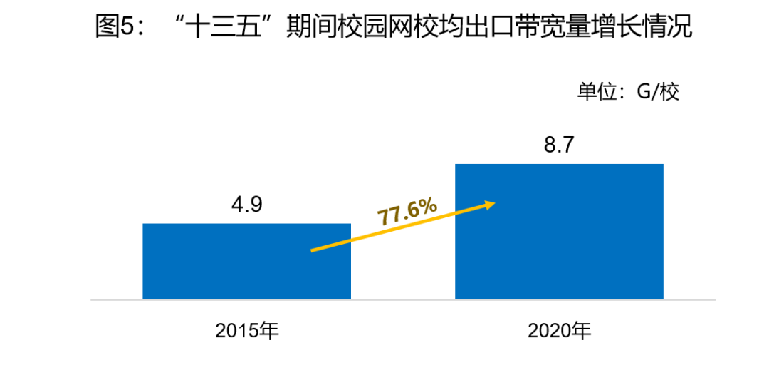 预计“十四五”末,校园网校均带宽实现翻倍增长,将达到15.4G/校,比2020年校均带宽提升6.7个G/校,提升幅度达77.0%。
