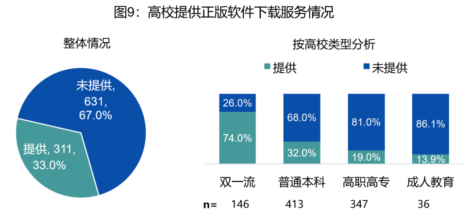 在942个样本高校中,有33.0%的高校为师生提供了正版软件下载和使用服务。从高校类型看,已有74.0%的双一流高校提供正版软件下载服务,明显高于其他类型高校;普通高校提供下载服务的占32.0%;高职高专和成人教育均有不足两成学校提供下载服务。