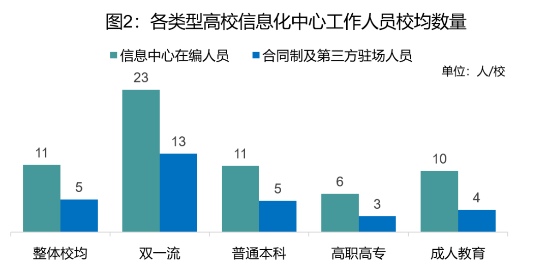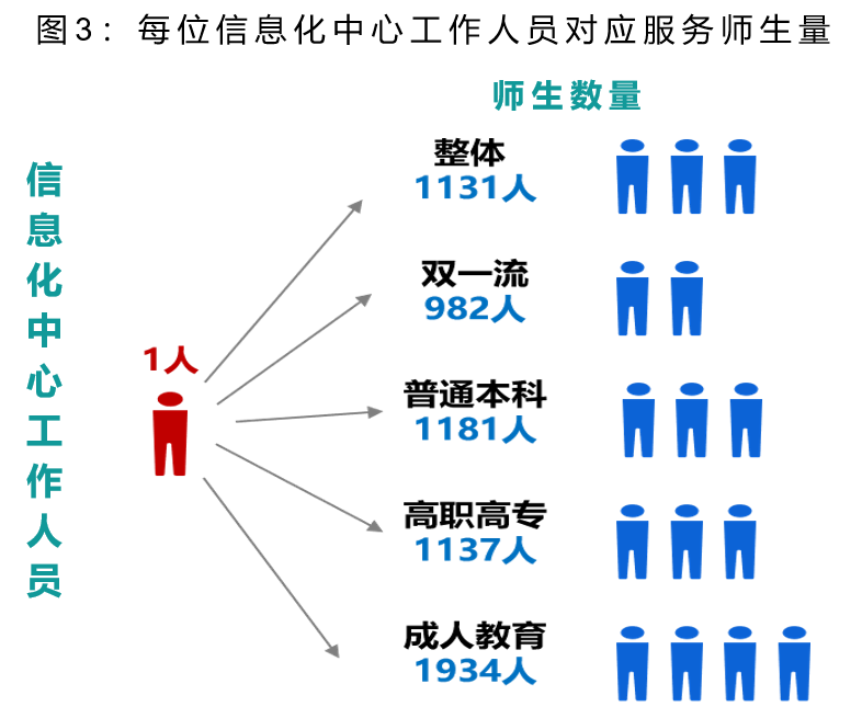 结合调研高校的校均师生数看,我国每位信息化中心人员要对应服务1131名师生;从高校类型看,双一流高校的每位信息化中心人员对应服务982名师生;普通本科高校对应服务1181名师生;高职高专对应服务1137名师生;成人教育对应服务1934名师生。