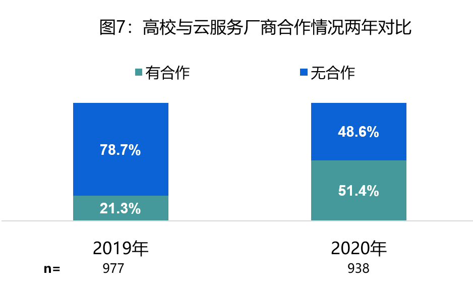 截至2020年10月,已有51.4%的高校与云服务厂商进行合作;与2019年对比,同云服务厂商合作的高校占比提升了30.1个百分比,实现翻倍增长。