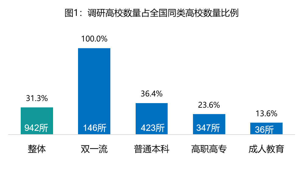 注:① 文章图表中未标注的2020年整体样本量均为942个,2019年整体样本量为977个。② 全国高校数量依据教育部公布的《全国高等学校名单》截至2020年6月30日数据,共计3005所高校。全国双一流高校共计140所,本次调研包含6所双一流高校的分校区或二级学院的样本,故总计146所,6所学校为:北京大学医学部、东北大学(秦皇岛)、上海交通大学医学院、华北电力大学(保定)、中国石油大学(北京)克拉玛依校区和哈尔滨工业大学(深圳)。