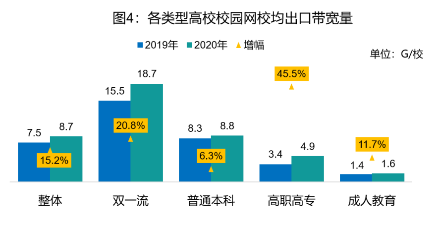 从高校类型看,双一流高校校均带宽为18.7G/校,是普通本科院校的2.1倍;高职高专院校校均带宽提升幅度较大,比2019年提高了45.5%,达到4.9G/校。