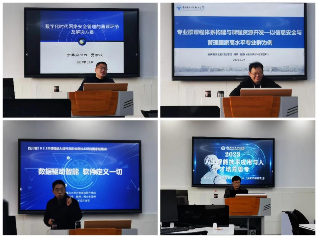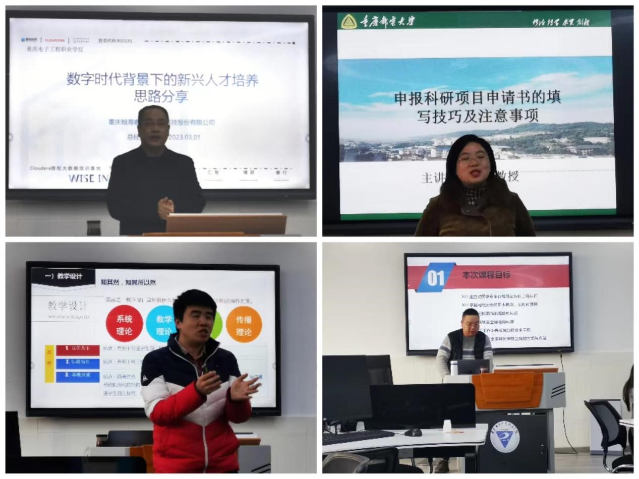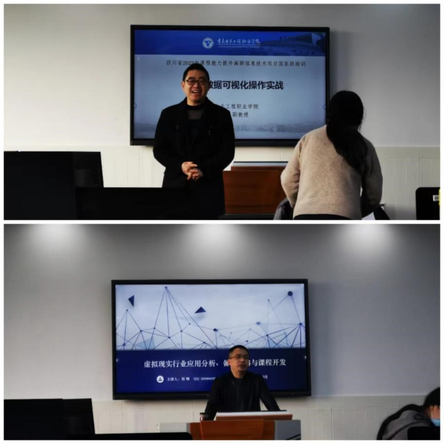 此次培训历时两周,邀请重庆大学、重庆师范大学、重庆电子工程学院的专家教授及企业高级工程师从回归教育本质、WPS技能提升、三教改革背景下的职业教育教材建设与实践、以学生为中心的课堂教学设计与实施、人工智能发展与人才培养、信创背景下得职业教育专业课程及产教融合改革与实践、课程资源开发与建设、数据驱动智能、软件定义一切、造就创新人才、数字化时代网络管理、数字时代背景下的新兴人才培养思路、科研项目申报、教育信息化工具、职业教育的有效课堂、信息安全意识、虚拟现实行业应用与人才培养、数据的可视化等职业院校发展热点话题和亟待解决的问题进行了研讨和培训。