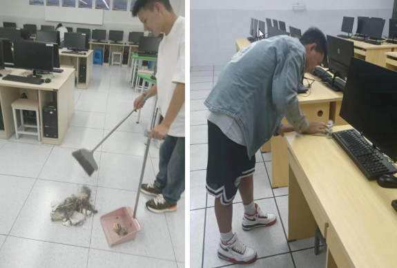 在进行简单的任务分配后,同学们积极清理垃圾,不怕脏,不喊累,相互配合,扫地、拖地、抹桌子、清理电脑桌卫生死角、擦拭电脑屏幕键盘,工作认真细致,用自己的实际行动为计算机机房增添一份清晰,一抹明亮。