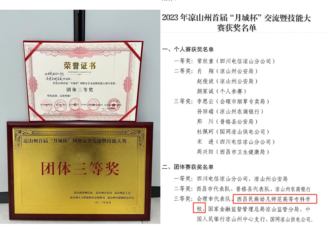 近日,州委网信办、州公安局、州总工会、州人力资源社会保障局、州互联网应急中心发布了《关于2023年凉山州首届“月城杯”网络安全交流暨技能大赛比赛结果的通报》,西昌民族幼专杨洋老师团队荣获大赛团体三等奖,是凉山教体系统唯一获奖团队。这是我校在2021年荣获州委宣传部、州委网信办、西昌学院举办的“2021年凉山州网络安全知识竞赛”一等奖后在网络安全领域的又一新突破。