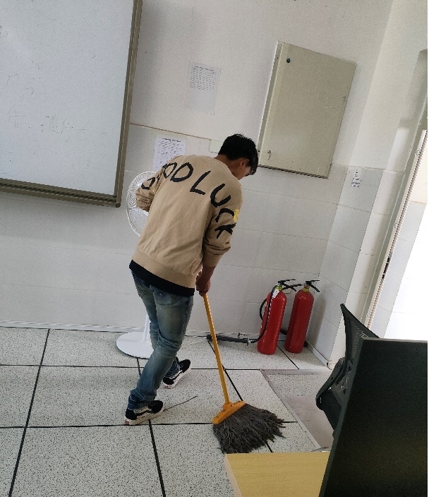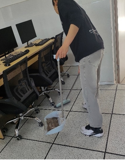 同学们积极清理垃圾,不怕脏,不喊累,相互配合,扫地、拖地、抹桌子、清理电脑桌卫生死角、擦拭电脑屏幕键盘,工作认真细致,用自己的实际行动为计算机机房增添一份清晰,一抹明亮。