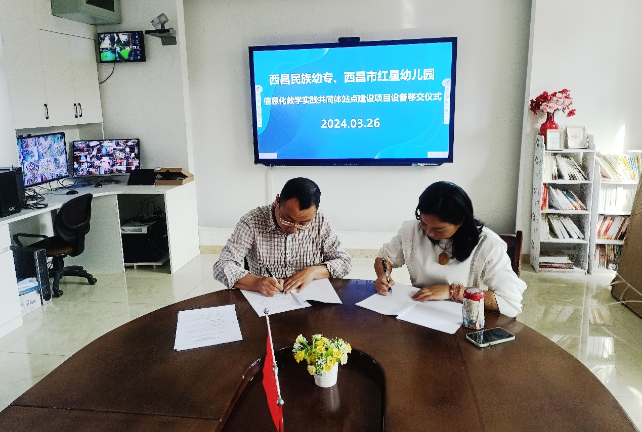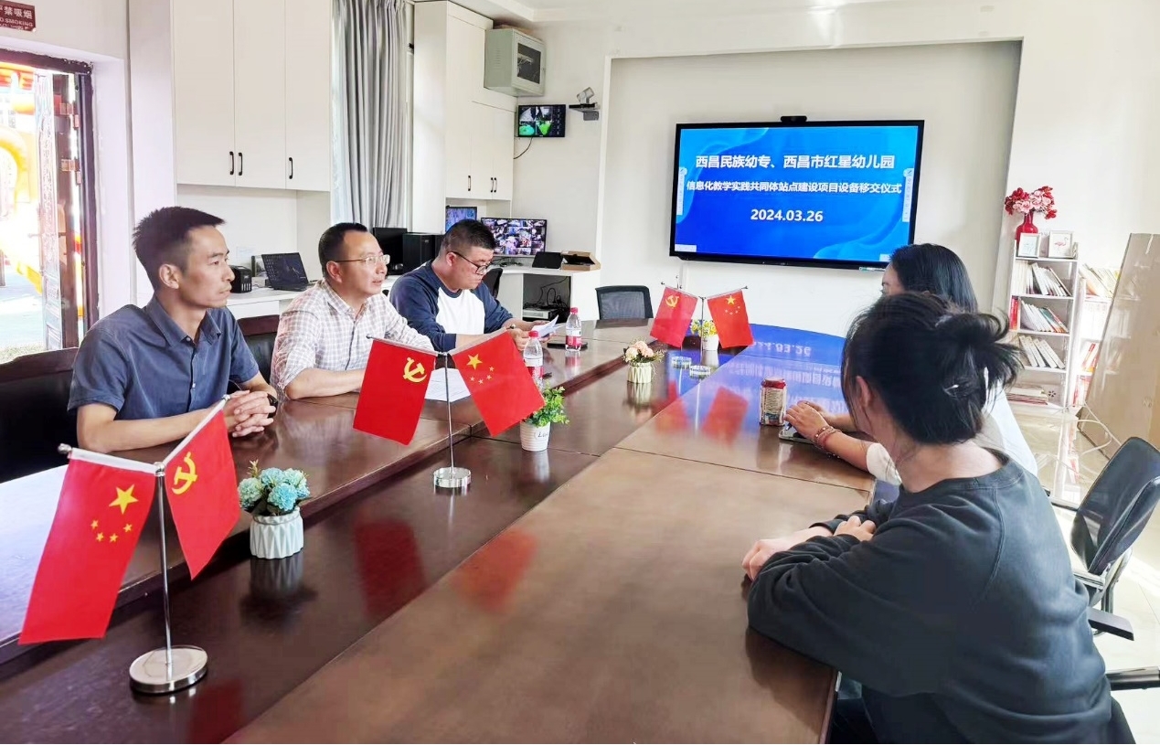 2024年3月26日,西昌民族幼专信息技术系(中心)主任邹玉泉一行到西昌市红星幼儿园,与胡莉纯园长及陈磊副园长就信息化教学实践共同体建设进行了深入交流座谈,并顺利完成站点建设设备移交仪式。